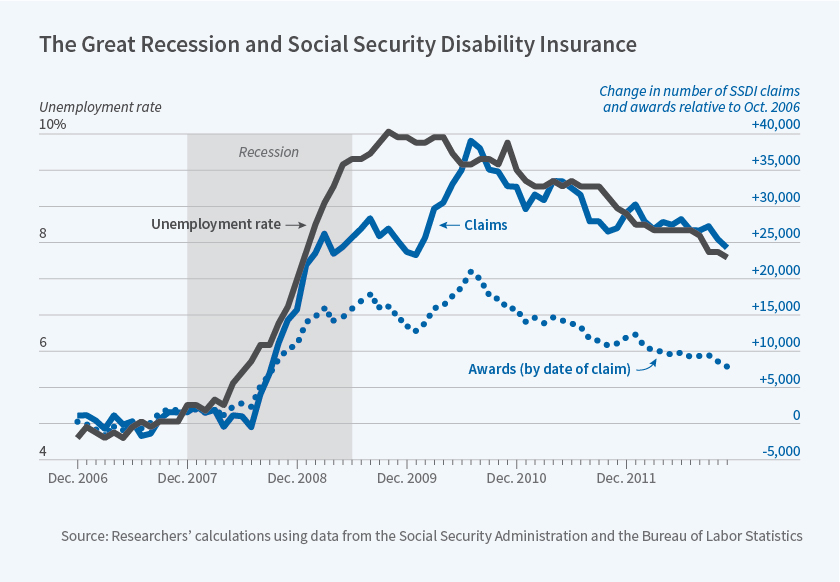 During the Great Recession, which began in late 2007, the U.S. unemployment rate rose from 5.0 to 10.0 percent. The loss of millions of jobs during this period is likely to have affected DI applications and awards. Researchers Nicole Maestas, Kathleen Mullen, and Alexander Strand explore this question in their recent study, The Effect of Economic Conditions on the Disability Insurance Program: Evidence from the Great Recession (NBER Working Paper 25338).