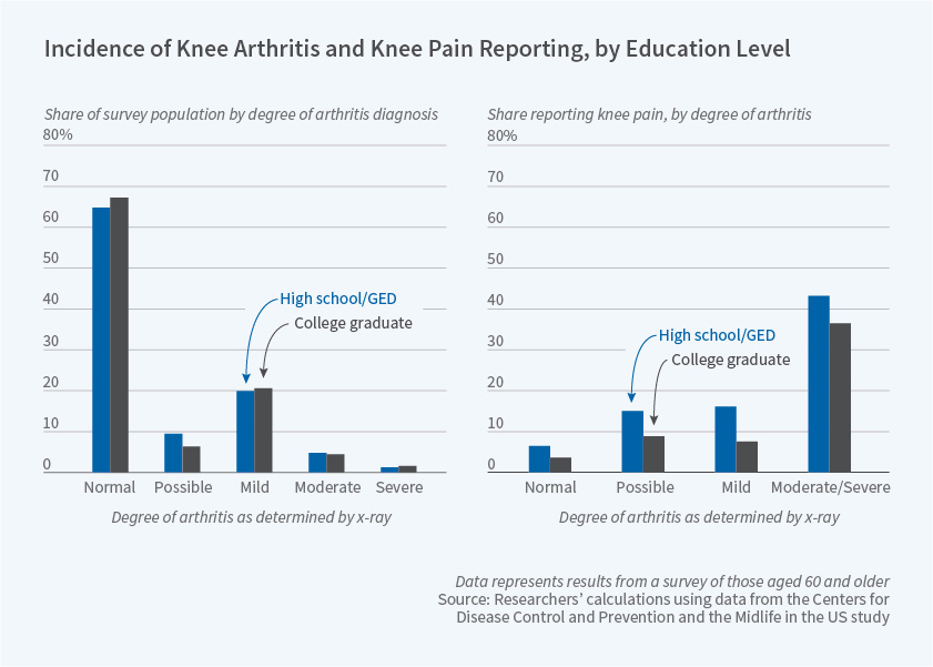 A (Meara): In our paper, we saw that two workers with identical health on objective measures like an x-ray or MRI of the knee can report very different levels of pain in ways that are linked to education. These educational differences tracked differences in physical demands of occupations more likely among high school graduates than college attendees. Although automation lessens the physical demands of some occupations, the fastest growing occupations in the US, home health care and other personal care jobs, are both physically demanding and hard to automate. As more workers move into physically demanding service sector jobs, we can expect musculoskeletal conditions to remain an important source of disability and claims for years to come.