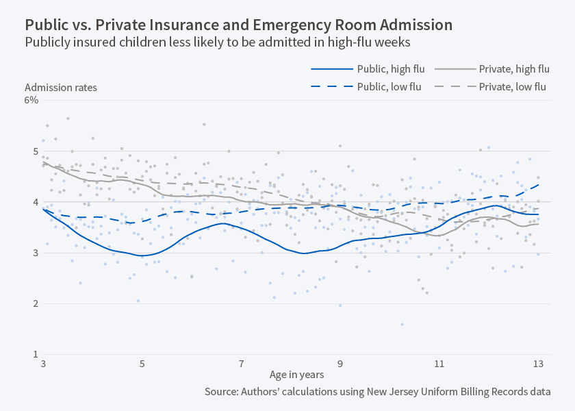 Children covered by private health insurance are more likely to be admitted to the hospital after a visit to the emergency room than children covered by a public health plan, such as Medicaid or the State Children's Health Insurance Program. This is the conclusion of Diane Alexander and Janet Currie's study, Are Publicly Insured Children Less Likely to Be Admitted to Hospital Than the Privately Insured (and Does It Matter)? (NBER Working Paper No. 22542). The study is based on an analysis of the health records of all children between the ages of three months and 13 years treated at a New Jersey hospital emergency room between 2006 and 2012.